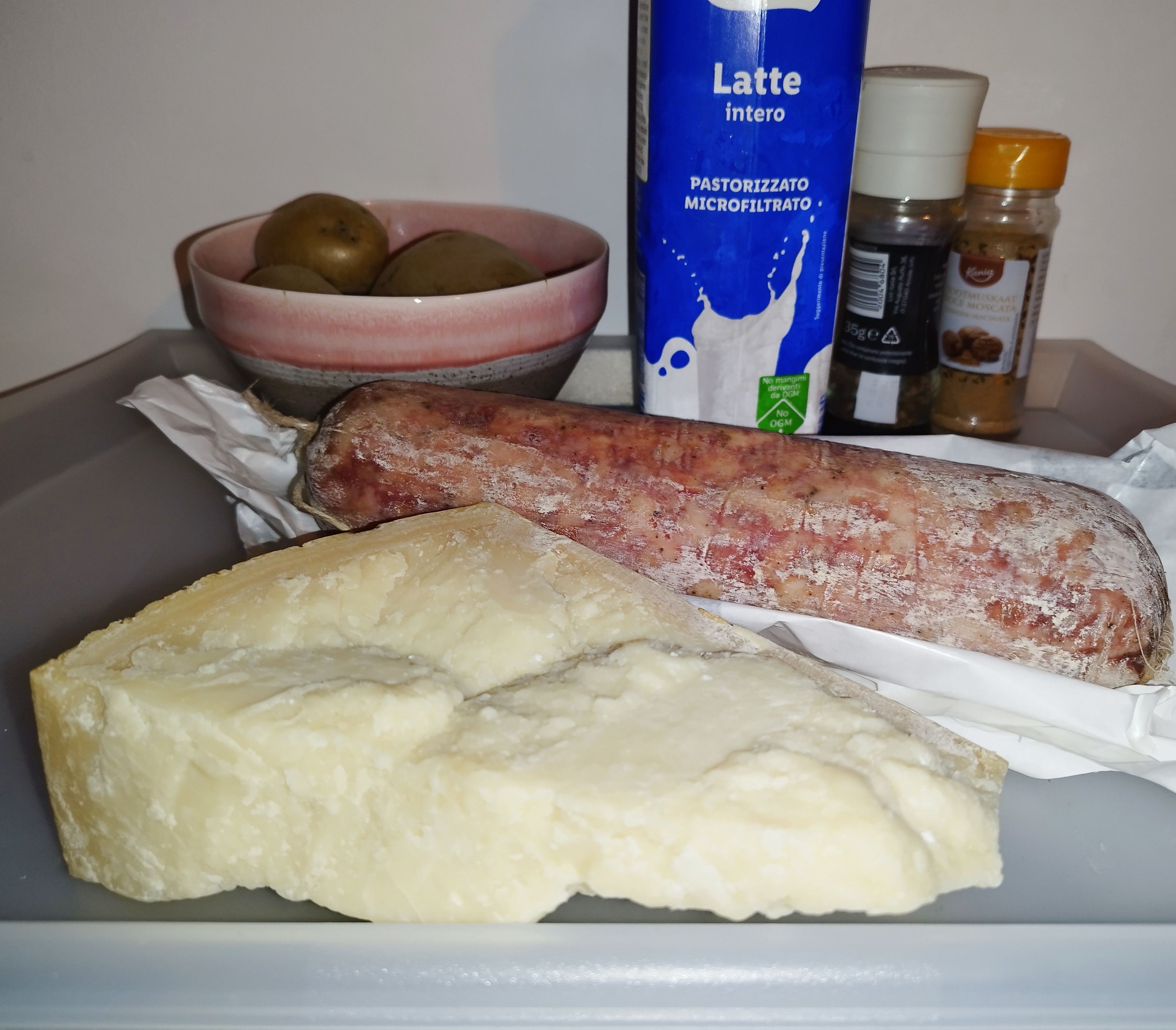 Fate sciogliere il burro in una pentola e nel frattempo sbucciate le patate e schiacciatele, poi mettetele nella pentola insieme a latte, formaggio, noce moscata, sale e pepe. Fate sobbollire a fiamma bassissima per circa 5 minuti o comunque fino a quando il purè non avrà raggiunto la giusta consistenza, mescolandolo continuamente con una frusta.